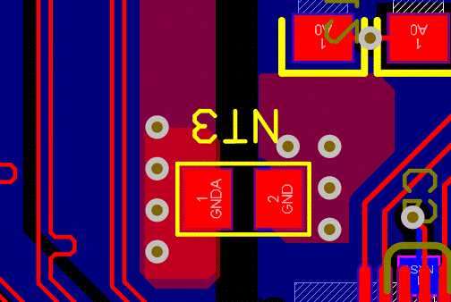 分離地平面:將地線分為模擬地和數(shù)字地兩個區(qū)域,并使用兩個獨立的地平面來布線。這樣可以防止模擬信號和數(shù)字信號間的互相干擾,其中,模擬地與數(shù)字地的距離不下于1mm,由于結(jié)構(gòu)限制畫不了這么寬的則可適當?shù)臏p小。