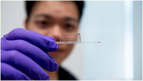 芝加哥大學(xué)科學(xué)家開(kāi)發(fā)出一種只有幾個(gè)原子厚度的玻璃晶體,可以捕獲和攜帶光。圖為研究人員拿著這種材料。 圖片來(lái)源:Jean Lachat/物理學(xué)家組織網(wǎng)
