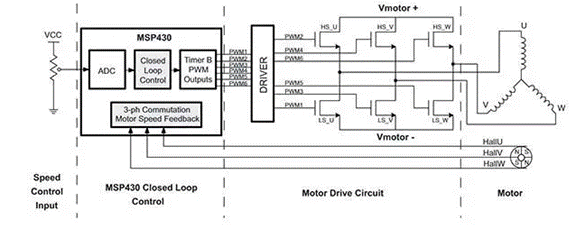 圖 2:三相 BLDC 電機的典型閉環(huán)控制系統(tǒng)包括控制器、驅動器和功率晶體管半橋 H。(圖片:德州儀器)