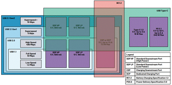 隨著時(shí)間推移,消費(fèi)者開始要求USB提供更多功能。他們想通過USB電纜快速給電池充電,此時(shí)500 mA最大電流已經(jīng)無法滿足要求。BC1.2標(biāo)準(zhǔn)允許通過USB電纜傳輸高達(dá)7.5 W功率——5 V電壓 和1.5 A電流,該標(biāo)準(zhǔn)滿足了這些消費(fèi)者的需求。BC1.2標(biāo)準(zhǔn)擴(kuò)展了通過USB電纜為電池充電的能力,在BC1.2標(biāo)準(zhǔn)之后,每一項(xiàng)新標(biāo)準(zhǔn)都在之前的基礎(chǔ)上增加了功率容量。Type-C 1.3將功率容量擴(kuò)展到15 W(最大值),而USB PD 3.0使系統(tǒng)功率升級(jí)達(dá)到100 W(最大值)。其最新的規(guī)格更新USB PD3.1將功率容量進(jìn)一步擴(kuò)展到了 240 W(最大值)。