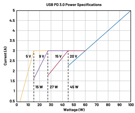 BC1.2和Type-C 1.3繼續(xù)提供以前在所有USB標(biāo)準(zhǔn)中使用的5 V供電 軌,但通過將最大電流增加到1.5 A和3 A,將功率容量分別增加到7.5 W和15 W。USB PD3.0同樣提高了電流和電壓容量,使功率容量達(dá)到100 W(最大值)。它允許兩個(gè)設(shè)備通過USB電纜傳輸高達(dá) 20 V電壓和5 A電流。新PD3.1規(guī)格支持高達(dá)48 V電壓和5 A電流。