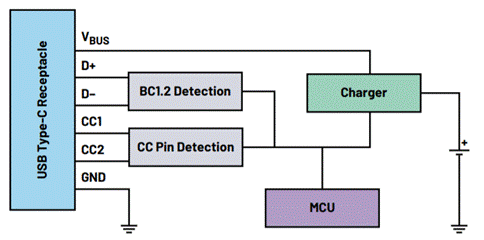 BC1.2檢測(cè)IC支持傳統(tǒng)的USB適配器。雖然更新的設(shè)備更廣泛地采用USB Type-C,但許多應(yīng)用仍然使用舊的USB規(guī)格。BC1.2兼容端口采用D+/D-引腳來傳輸電源的功率容量,而不是CC引腳。BC1.2檢測(cè)IC讀取D+/D-引腳,為仍然使用傳統(tǒng)USB標(biāo)準(zhǔn)的應(yīng)用配置充電。