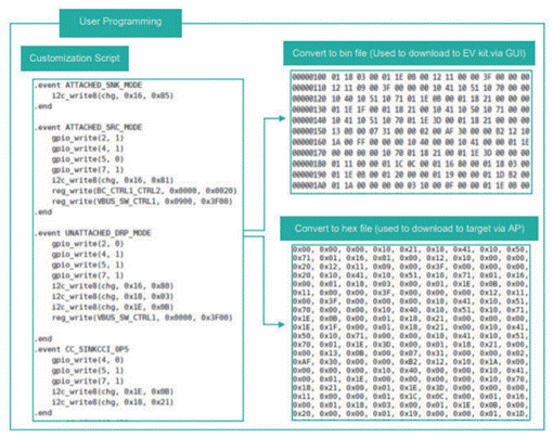 定制腳本是使用簡(jiǎn)單、易于使用的命令在GUI中編寫的。該軟件將定制腳本轉(zhuǎn)換為十六進(jìn)制格式,并將其寫入IC配置區(qū)域。開發(fā)人員可以根據(jù)基于其應(yīng)用需要提供的功能來定義簡(jiǎn)單的函數(shù)和序列。