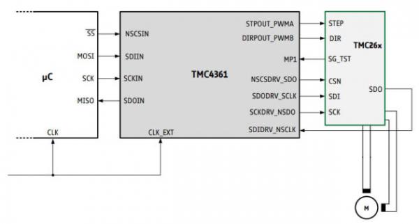 圖:TMC4361A 以 SPI 模式或者 S/D 模式連接 TMC2130 或 TMC2160 步進(jìn)驅(qū)動芯片
