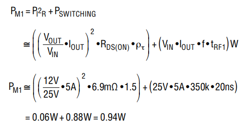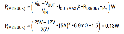 可通過選擇一個較低的開關(guān)頻率來降低 0.88W 的最大開關(guān)功耗。由于該計(jì)算是近似的,因此應(yīng)在 PCB 上測量實(shí)際的上升和下降時間以獲得更好的功耗估計(jì)。當(dāng)電路工作于降壓區(qū)時,M2 中的最大功率耗散出現(xiàn)在最大輸入電壓下。若采用 6.9mΩ FDMS7672,則功率耗散為: