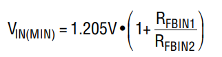 通過在 VIN、FBIN 和 GND 之間連接分壓電阻,F(xiàn)BIN 引腳可提供一種用于調(diào)節(jié)輸入電壓或創(chuàng)建欠壓閉鎖功能的方法。請參閱 “方框圖” 中的誤差放大器 A3,當(dāng) FBIN 低于1.205V 基準(zhǔn)時,VC 會拉低。例如,倘若 VIN 由一個阻抗相對較高的電源 (即:太陽能板) 提供,且吸收電流把 VIN拉至一個預(yù)設(shè)限值以下,則 VC 將被降低,從而減小從輸入電源吸收的電流并限制電壓降。請注意,在強(qiáng)制連續(xù)模式中(MODE 引腳為低電平)使用該功能會導(dǎo)致從輸出吸收電流并迫使其進(jìn)入輸入端。如果不需要這種運(yùn)行方式,則使用不連續(xù)或突發(fā)模式操作。如需設(shè)定最小輸入電壓或輸入電壓穩(wěn)壓值,可采用下式: