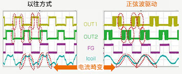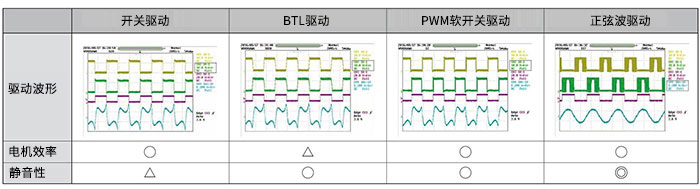而正弦波驅(qū)動則具有可通過外部電壓來調(diào)整PWM軟開關(guān)區(qū)間的線圈電流的功能,因此可使線圈電流的波形變得平緩以接近正弦波。可進(jìn)一步減少線圈電流的波形失真,從而實現(xiàn)更出色的靜音性。
