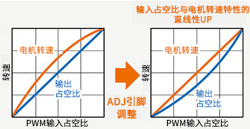 風(fēng)阻損耗是旋轉(zhuǎn)部分與空氣等之間的摩擦阻力造成的損耗。例如,在風(fēng)扇電機(jī)中,由于電機(jī)的特性,即使與輸入占空比相對的輸出占空比為直線,中間占空比附近的轉(zhuǎn)速也可能會升高。通過ADJ引腳對輸出占空比的直線性進(jìn)行調(diào)整,可提高電機(jī)轉(zhuǎn)速的直線性,并可提高速度設(shè)置精度。