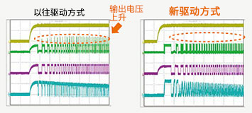 可抑制正向空轉(zhuǎn)上電時、反向空轉(zhuǎn)上電時、堵轉(zhuǎn)檢出/恢復(fù)時、扭矩輸入急劇變化時等情況下發(fā)生轉(zhuǎn)速變動時的輸出電壓跳變現(xiàn)象。
