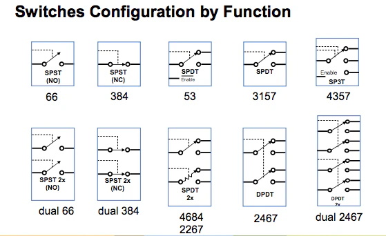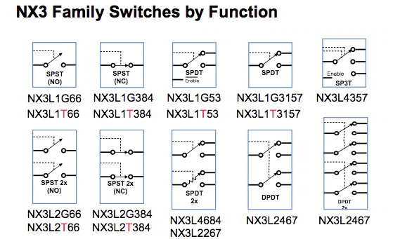 極數(shù)表示公共端子(或活動觸點)的數(shù)量,而擲數(shù)表示公共側(cè)可以連接的備用端子的數(shù)量。每個封裝中的開關(guān)可以是單開關(guān)、雙開關(guān)或多個開關(guān)(通常是偶數(shù))。這些開關(guān)可以單獨激活,也可以同時激活。恩智浦高性能模擬開關(guān)產(chǎn)品組合包含采用上述每種配置的設(shè)備。NX3 系列提供所有標(biāo)準(zhǔn)配置 SPST、SPDT……單、雙、四。