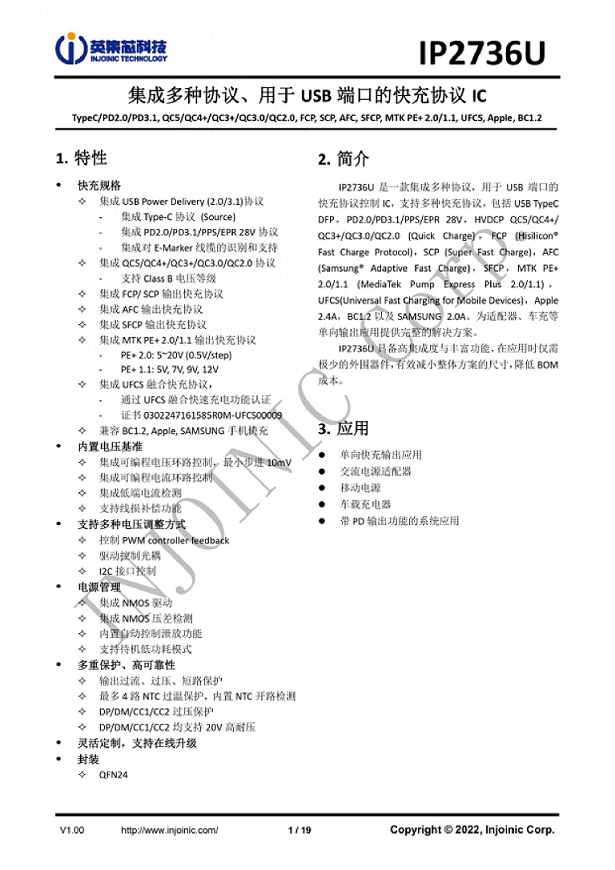 首先介紹的是IP2736,協(xié)議芯片在充電器中起到非常重要的作用,協(xié)議芯片一方面連接到充電器初級(jí)反饋或者次級(jí)降壓反饋,并通過(guò)連接的用電設(shè)備,調(diào)節(jié)充電器的輸出電壓為用電設(shè)備所需要的電壓,從而提供豐富的設(shè)備支持。