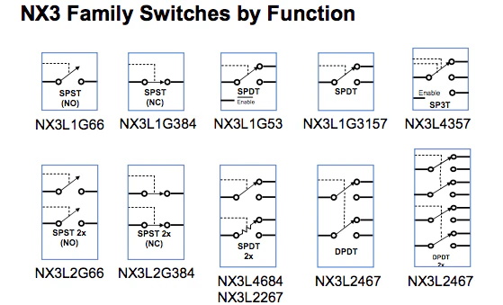 極數(shù)表示公共端子(或活動觸點)的數(shù)量,而擲數(shù)表示公共側可以連接的備用端子的數(shù)量。每個封裝中的開關可以是單開關、雙開關或多個開關(通常是偶數(shù))。這些開關可以單獨激活,也可以同時激活。恩智浦高性能模擬開關產(chǎn)品組合包含采用上述每種配置的設備。NX3 系列提供所有標準配置 SPST、SPDT……單、雙、四。