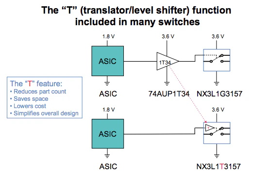 在某些應用中,模擬開關位于低壓 ASIC 和較高電源電壓組件之間的接口處。為了正確激活開關,通常在選擇引腳上使用電壓轉換器(或電平轉換器)以確保滿足激活閾值。恩智浦模擬開關提供集成了轉換器功能的完整器件系列,從而節(jié)省部件數(shù)量、PCB 空間并降低總體系統(tǒng)成本。