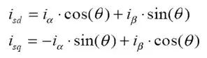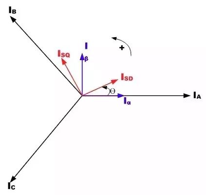 Clarke變換采用三相電流IA,IB以及IC,其中IA和IB在固定座標定子相中的電流被變換成Isd和Isq,成為Park變換d,q中的元素。其通過電機通量模型來計算的電流Isd,Isq以及瞬時流量角θ被用來計算交流感應電機的電動扭矩。