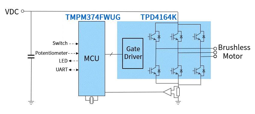 即日起用戶可訪問東芝官網(wǎng)獲取“無感直流無刷電機驅(qū)動電路參考設計”,該參考設計使用了新產(chǎn)品TPD4164K,以及帶有矢量控制引擎的TMPM374FWUG微控制器的相關(guān)功能。