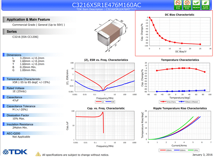 靜態(tài)容量隨其直流偏置工作電壓的增大而減少,最大甚至?xí)陆?0%。比如一個X5R 47UF 25V的電容,在25V的直流電壓下,其容量可能只有4.7uF,下圖附錄TDK 一個X5R電容的規(guī)格書 關(guān)于容量與電壓的關(guān)系圖,(其實(shí)仔細(xì)看下圖的的話,你會發(fā)現(xiàn)電容容量溫度跟容量也有關(guān)系)