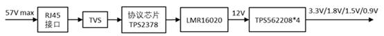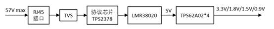 如下圖1是非隔離的無(wú)線接入點(diǎn)電源系統(tǒng)示意圖。其中,TPS2378是PoE接口協(xié)議芯片,極限耐壓為100V。緊接著的是用來做降壓轉(zhuǎn)換的兩級(jí)Buck芯片,如業(yè)界廣泛使用的LMR16020和TPS562208。為了符合雷電浪涌沖擊要求,實(shí)際產(chǎn)品一般在協(xié)議芯片前放置TVS管。