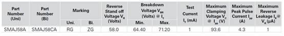 PoE協(xié)議規(guī)定的供電電壓最大值為57V,應(yīng)用中多選取工作電壓58V的TVS,如SMAJ58A。從圖2可以看到,雪崩擊穿電壓最大可達(dá)71.2V,超出LMR16020的極限耐壓65V。因此第一級(jí)Buck芯片偶有概率性失效的事件發(fā)生。