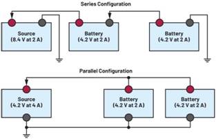 在電池管理系統(tǒng)中,有幾種電池配置方法,可分別實現(xiàn)不同的結(jié)果。一種配置方法是將電池進行串聯(lián),以提高電壓,但電池容量保持不變,這通常適用于高功率產(chǎn)品。另一種配置方法是將電池進行并聯(lián),這會提高容量,但電壓保持不變,F(xiàn)在,延長電池壽命對消費電子設(shè)備如此關(guān)鍵,這促使制造商尋求創(chuàng)新方法來保存和擴展電池組的有用容量。延長電池壽命簡單有效的方法是并聯(lián)充電。簡而言之,通過并聯(lián)充電電池,用戶可以一次為多個電池充電,從而實現(xiàn)更長的電池壽命并提高可靠性。圖1簡單描述了常用的串聯(lián)和并聯(lián)電池配置。