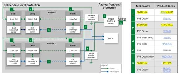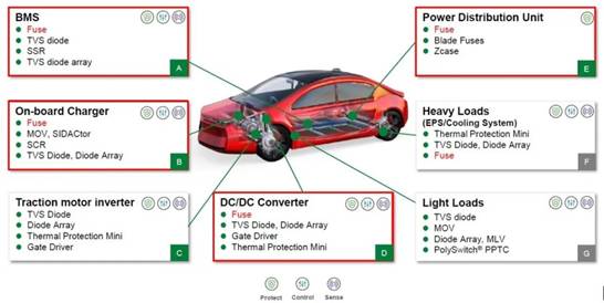 Littelfuse作為全球保護(hù)器件的領(lǐng)導(dǎo)品牌,汽車硬件回路的過(guò)壓過(guò)流保護(hù)產(chǎn)品自然也少不了,保險(xiǎn)絲做為過(guò)流保護(hù)器之一,在電池管理系統(tǒng)、車載充電機(jī)、配電單元、直流變換器等應(yīng)用最為廣泛,其中電池管理系統(tǒng)采用貼片保險(xiǎn)絲,其余使用引線或鎖螺栓保險(xiǎn)絲。另外控制板與信號(hào)端口等為了提高重復(fù)使用率可以采用PTC熱敏電阻作為過(guò)流保護(hù),又叫自恢復(fù)保險(xiǎn)絲。