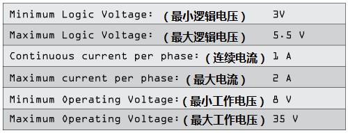 因?yàn)锳4988內(nèi)置了譯碼器,我們可以可以通過(guò)控制器的2個(gè)引腳來(lái)控制步進(jìn)電機(jī),一個(gè)控制旋轉(zhuǎn)方向,另一個(gè)控制步數(shù)。A4988提供了五種不同的微步控制:全步(full-step),半步(haft-step),四分一步(quarter-step),八分之一步(eight-step)和十六分之一步(sixteenth-step)。此外,它還配備了一個(gè)調(diào)節(jié)電流輸出、過(guò)熱保護(hù)和過(guò)流保護(hù)的電位計(jì)。A4988的邏輯電壓范圍是:3~5.5V,如果配備較好的散熱條件每相最大電流可達(dá)2A,在沒(méi)有配備散熱器的情況下,每相連續(xù)電流最好控制在1A范圍內(nèi)。