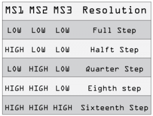 MS1, MS2 和 MS3針腳用于微步設(shè)置,如上圖所示。ENABLE針腳用于打開(kāi)和關(guān)閉場(chǎng)效應(yīng)管的輸出,低電平打開(kāi),高電平關(guān)閉。