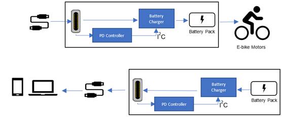 圖 1:通過 USB 為電動自行車充電(上)和通過電動自行車為個人設(shè)備充電(下)