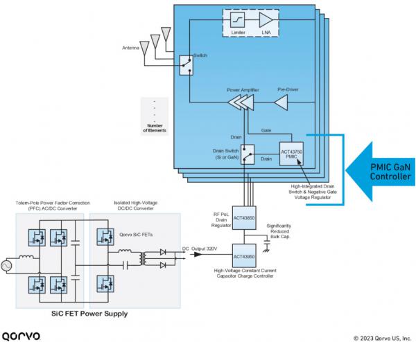 ACT41000可用于低電壓解決方案;其漏極電壓范圍為3至24V。往期博文《使用電源管理模塊為GaN功率放大器上電(和斷電)》對這一器件進(jìn)行了概述;此篇博文和相關(guān)視頻教程(qorvo.com/design-hub/videos/using-advanced-power-management-to-optimize-gan-pa-performance)介紹了如何在系統(tǒng)中設(shè)置和使用該器件。