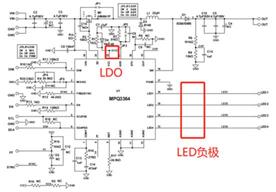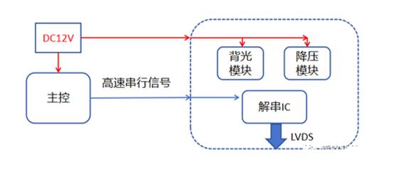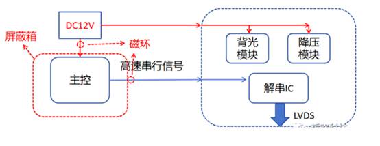 客戶的產(chǎn)品為一個顯示屏驅(qū)動電路,通過將主控傳輸過來的高速串行信號進(jìn)行解碼,再傳送到顯示屏。主要模塊分為三部分,一個是背光升壓模塊,用于給背光供電,開關(guān)頻率為2.2MHz,一個是降壓模塊,給解串IC供電,開關(guān)頻率為500KHz,另一個是信號解串模塊,解串后輸出LVDS時鐘頻率為48MHz。簡單電路框架如下: