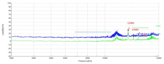從上面的數(shù)據(jù)中可以看到,出現(xiàn)了10MHz間隔的頻率點,并且在154MHz頻點處超標(biāo)。