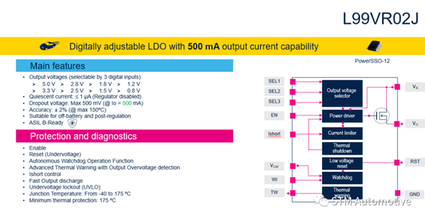 L99VR02J能夠直接連接到電池,具有使能、復位、自主看門狗、先進熱報警、快速輸出放電和IShort控制功能。