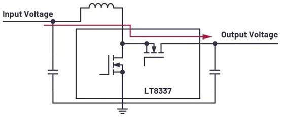 除了降壓-升壓解決方案(LT8210),升壓穩(wěn)壓器也支持直通模式。ADI公司新推出的 LT8337 Silent Switcher ® 升壓穩(wěn)壓器本身集成了直通模式。圖3展示了LT8337升壓轉(zhuǎn)換器背后的這一概念。啟用直通模式時,高端開關(guān)永久開啟,低端開關(guān)永久關(guān)閉。