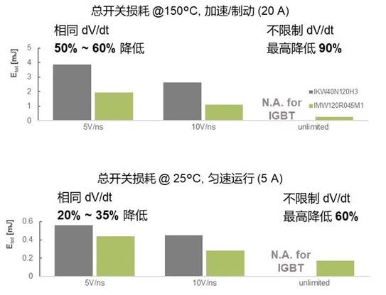 IGBT開(kāi)通瞬間電流往往會(huì)有過(guò)沖,這是反并聯(lián)二極管換流時(shí)產(chǎn)生的反向恢復(fù)電流。反向恢復(fù)電流疊加在IGBT開(kāi)通電流上,增加了器件的開(kāi)通損耗。IGBT的反并聯(lián)二極管往往是Si PiN二極管,反向恢復(fù)電流比較明顯。而SiC MOSFET的結(jié)構(gòu)里天然集成了一個(gè)體二極管,無(wú)需額外并聯(lián)二極管。SiC體二極管參與換流,它的反向恢復(fù)電流要遠(yuǎn)低于IGBT反并聯(lián)的硅PiN二極管,因此,即使在同樣的dv/dt條件下,SiC MOSFET的開(kāi)通損耗也低于IGBT。另外,SiC MOSFET可以使得伺服驅(qū)動(dòng)器與電機(jī)集成在一起,從而摒除線纜上dv/dt的限制,高dV/dt條件下,SiC的開(kāi)關(guān)損耗會(huì)進(jìn)一步降低,遠(yuǎn)低于IGBT。即使是開(kāi)關(guān)過(guò)程較慢時(shí),碳化硅的開(kāi)關(guān)損耗也優(yōu)于IGBT。