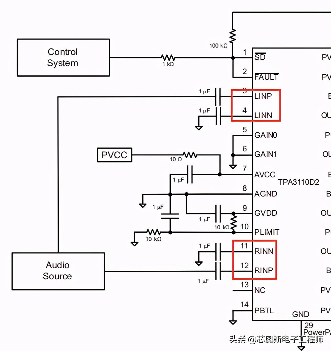 功放供電腳分PVCCL和PVCCR,不難看出是兩組獨立的供電,所以這兩個腳上放的電容一定要一樣,一定要平衡,這里可能就是很多小伙伴在做立體聲音響的時候,測試功率發(fā)現(xiàn)兩個聲道功率有相差的原因了。