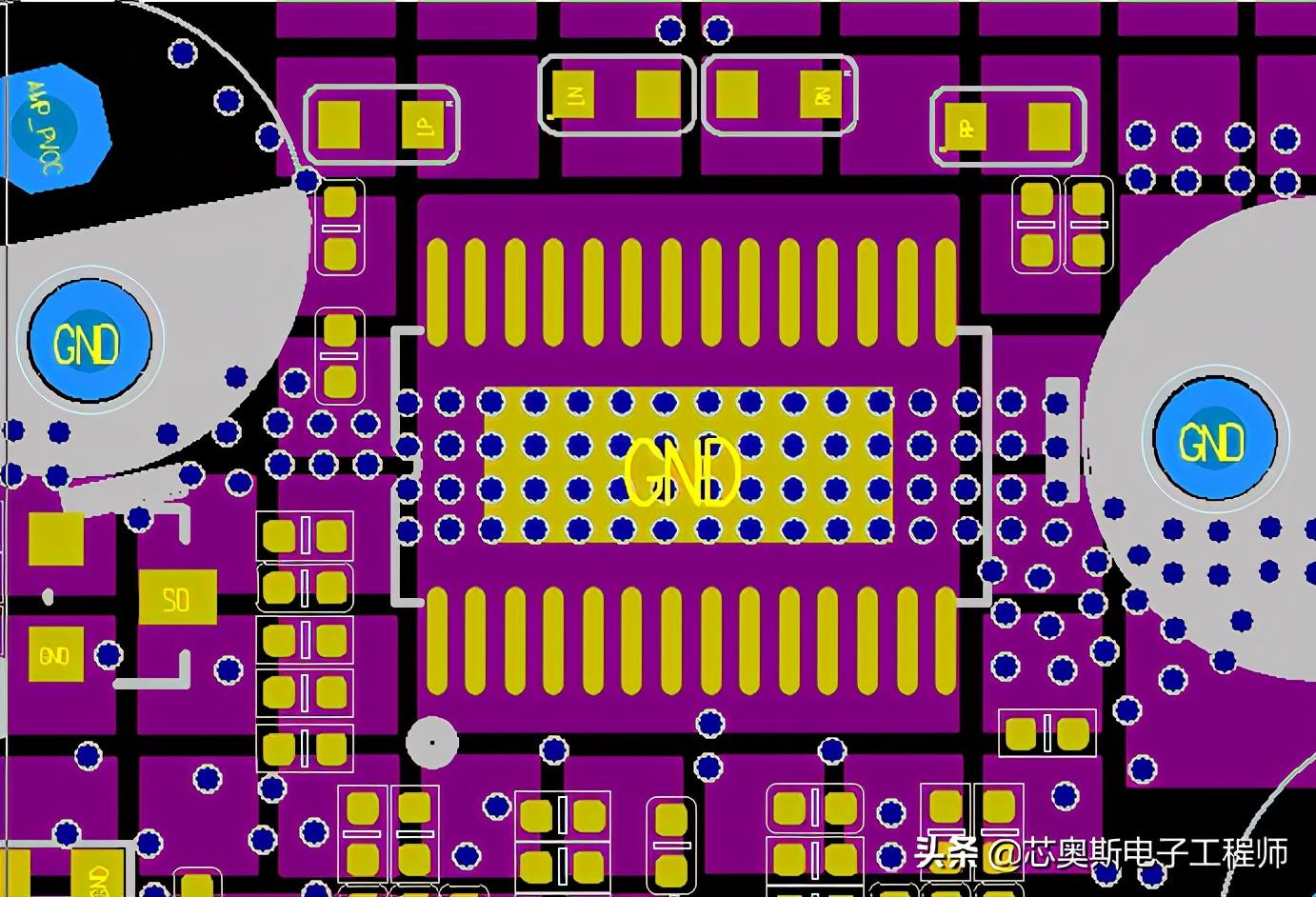 我們都知道,功放在工作的時候,會產(chǎn)生很多的熱量,如果功放散熱處理不好!會存在燒功放的危險。 一般情況下,功率在30W內(nèi)左右,基本上開窗開大些,和功放襯底多打過孔,是可以滿足散熱要求的,如下圖,但是如果功率過大,我們就要考慮增加散熱片或者風(fēng)扇了。