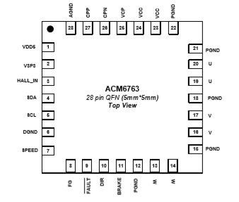 ACM6763是一款三相無刷直流電機驅動芯片,內部集成 無感三相無刷電機驅動算法、相電流檢測電流電路、柵極驅動電路以及功率MOS管. 支持最大5A的相電流.