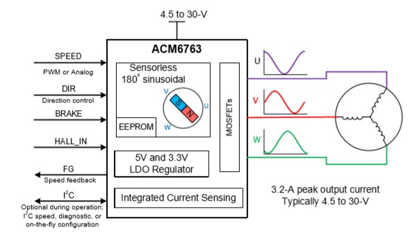 ACM6763的高集成度以及精簡外圍特別適用于高功率密 度、小尺寸、靜音要求高的三相無刷電機驅動器應用場景.