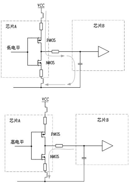 (3)內(nèi)部晶體管工作需要內(nèi)核時(shí)鐘或是外部時(shí)鐘同步,但是由于內(nèi)部延遲及各個(gè)晶體管不可能嚴(yán)格同步,造成部分晶體管完成狀態(tài)轉(zhuǎn)換,另一部分可能處于轉(zhuǎn)換狀態(tài),這樣一來(lái)處于高電平門(mén)電路的電源噪聲會(huì)傳到其它門(mén)電路的輸入部分。
