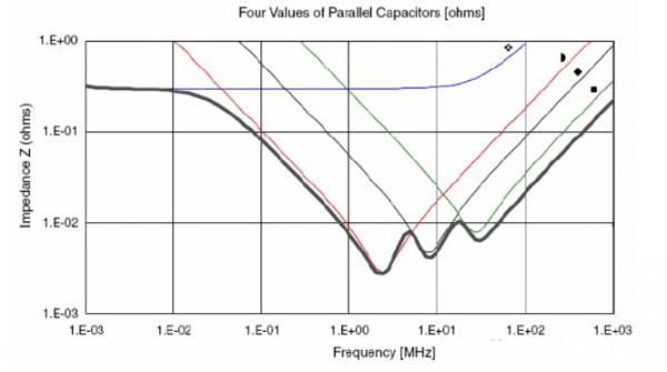 用一個(gè)電容組合的例子。這個(gè)組合使用的電容為:2個(gè)680uf鉭電容,7個(gè)2.2uf陶瓷電容(0805封裝),13個(gè)0.22uf陶瓷電容(0603封裝),26個(gè)0.022uf陶瓷電容(0402)。圖中上部平坦的曲線是680uf電容的阻抗曲線,其它三個(gè)容值的曲線為為圖中三個(gè)V字曲線,從左到右2.2uf →0.22uf→ 0.022uf。總的阻抗曲線為底部粗包路線。