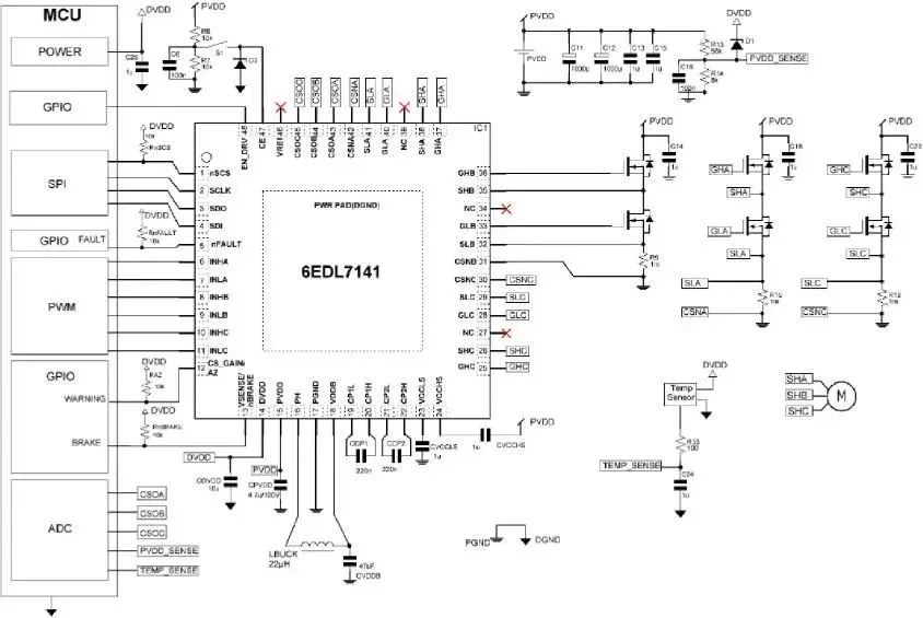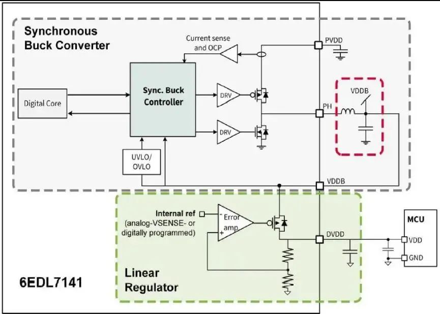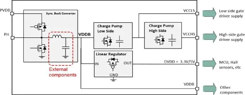 圖 3、圖 4 可以看到,MOTIX™ 6EDL7141 內(nèi)部集成高效同步 Buck DC-DC 轉(zhuǎn)換器為整個(gè)系統(tǒng)提供高壓供電,輸入電壓范圍寬至 5.5-60V,如果當(dāng) PVDD ≥9.5V,VDDB 能夠提供高達(dá) 600mA 的電流,同時(shí)配備由Buck 轉(zhuǎn)換器輸出供電的 LDO 穩(wěn)壓器可提供高達(dá) 300mA 的低噪聲數(shù)字電源。作為系統(tǒng)級(jí)設(shè)計(jì)時(shí),可以靈活選擇供電方式,如:Buck 或 LDO 輸出為外部組件(MCU、霍爾等)供電,為配套的 MCU 提供電源,從而省去了所需要的電源配置。