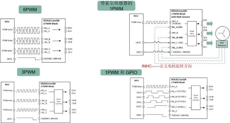 6EDL7141 提供 4 種不同的 PWM 模式和一個(gè)變種模式,以滿足不同的 MCU 需求。第一種模式是 6 PWM 模式,通過使用來自 MCU 的 6 個(gè) PWM 信號(hào)以最經(jīng)典方式驅(qū)動(dòng)?xùn)艠O驅(qū)動(dòng)器。