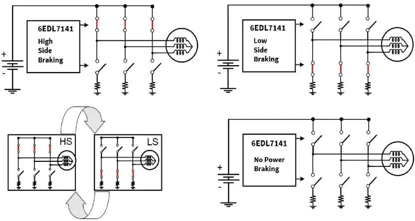 而在制動(dòng)時(shí),6EDL7141 將在制動(dòng)事件發(fā)生時(shí)將柵極驅(qū)動(dòng)器輸出設(shè)置為預(yù)定義狀態(tài),在與 XMC1400 或其他 MCU 集成時(shí),可以通過內(nèi)部和外部的雙重制動(dòng),來提高系統(tǒng)的可靠性。外部的制動(dòng)即是由外部 MCU 或系統(tǒng)中的任何其他故障源處理。6EDL7141提供以下幾種制動(dòng)模式,如圖6所示。