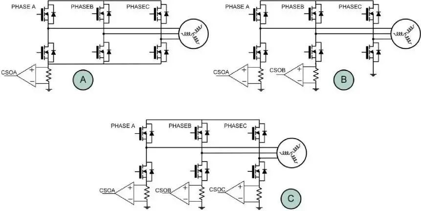 圖 8 支持單(A)、雙(B)和三(C)組并聯(lián)電流檢測(cè)配置