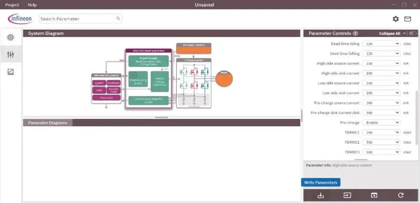 英飛凌為電機(jī)驅(qū)動(dòng)控制設(shè)計(jì)提供了 GUI 工具,用戶可以通過 GUI 界面實(shí)現(xiàn)器件的選擇,參數(shù)的任意配置,這些只需要通過參數(shù)寫入即可以實(shí)現(xiàn)可視化的參數(shù)配置和效果,大大簡化和節(jié)約設(shè)計(jì)時(shí)間。調(diào)節(jié)后的參數(shù)可以存儲(chǔ)在 OTP 中。完成 OTP 操作后,還可以通過 SPI 命令更改一些配置,6EDL7141 提供高達(dá) 50 個(gè)參數(shù)可以通過 SPI 配置。