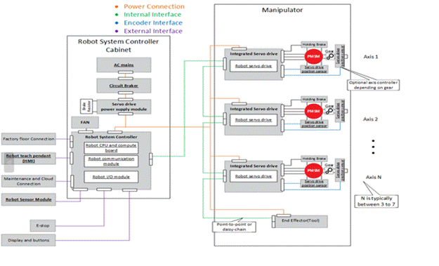 雖然集中式控制架構可以滿足重有效載荷工業(yè)機器人等大功率自動化系統(tǒng)的性能和效率設計要求,但這些系統(tǒng)需要使用額外電纜,連接機柜和關節(jié)的機械電機,以及位置傳感器和聚合器。這些電線不僅成本高昂,而且容易磨損,需要維護。