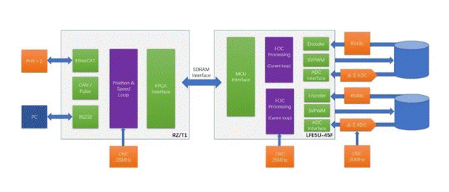 除了ASIC,F(xiàn)PGA也被用于實(shí)現(xiàn)FOC控制算法,例如中電港聯(lián)合全球知名半導(dǎo)體解決方案供應(yīng)商瑞薩電子及萊迪思半導(dǎo)體推出高性能EtherCAT伺服驅(qū)動(dòng)解決方案,采用Renesas MPU+Lattice FPGA雙芯片架構(gòu)。