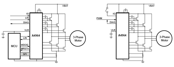A4964 是三相無傳感器、無刷直流 (BLDC) 電機(jī)控制器,適用于 N 溝道功率MOSFET,特別針對汽車應(yīng)用而設(shè)計(jì)。其設(shè)計(jì)用于為系統(tǒng)提供電機(jī)控制功能,在該系統(tǒng)中,小型微控制器為中央 ECU 和智能故障和狀態(tài)處理的通信接口。A4964 提供微控制器的電源和看門狗,以及微控制器與中央 ECU 和點(diǎn)火開關(guān)之間的高壓接口。A4964 還可以作為獨(dú)立單片機(jī)遠(yuǎn)程電機(jī)控制器運(yùn)行。電機(jī)由三相正弦電流驅(qū)動(dòng)器驅(qū)動(dòng),該換相無需單獨(dú)的位置傳感器,可通過電機(jī)反電動(dòng)勢的監(jiān)控決定。無傳感器啟動(dòng)方案包括正向和反向預(yù)旋轉(zhuǎn)(風(fēng)力發(fā)電)檢測和同步,并使 A4964 適用于各種電機(jī)和負(fù)載組合。A4964 運(yùn)行采用占空比(電壓)控制、電流(轉(zhuǎn)矩限制)控制和閉環(huán)速度控制?刂颇J、工作模式和控制參數(shù)通過 SPI 兼容串行接口進(jìn)行編程。單電流檢測放大器通過串行接口提供峰值電流限制和平均電流測量。集成診斷提供欠壓、過熱和電源橋故障指示,并可在大多數(shù)短路條件下保護(hù)電源開關(guān)。A4964 采用 36 端子 QFN 和 32 引腳 QFP 封裝,兩種均帶裸露的散熱焊盤。