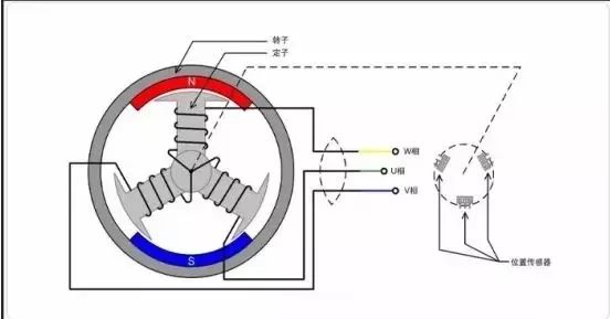 無(wú)刷直流電機(jī)的定子是線圈繞組電樞,轉(zhuǎn)子是永磁體。如果只給電機(jī)通以固定的直流電流,則電機(jī)只能產(chǎn)生不變的磁場(chǎng),電機(jī)不能轉(zhuǎn)動(dòng)起來(lái),只有實(shí)時(shí)檢測(cè)電機(jī)轉(zhuǎn)子的位置,再根據(jù)轉(zhuǎn)子的位置給電機(jī)的不同相通以對(duì)應(yīng)的電流,使定子產(chǎn)生方向均勻變化的旋轉(zhuǎn)磁場(chǎng),電機(jī)才可以跟著磁場(chǎng)轉(zhuǎn)動(dòng)起來(lái)。
