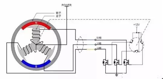 如圖2所示為無(wú)刷直流電機(jī)的轉(zhuǎn)動(dòng)原理示意圖,為了方便描述,電機(jī)定子的線圈中心抽頭接電機(jī)電源 POWER,各相的端點(diǎn)接功率管,位置傳感器導(dǎo)通時(shí)使功率管的 G極接 12V,功率管導(dǎo)通,對(duì)應(yīng)的相線圈被通電。由于三個(gè)位置傳感器隨著轉(zhuǎn)子的轉(zhuǎn)動(dòng),會(huì)依次導(dǎo)通,使得對(duì)應(yīng)的相線圈也依次通電,從而定子產(chǎn)生的磁場(chǎng)方向也不斷地變化,電機(jī)轉(zhuǎn)子也跟著轉(zhuǎn)動(dòng)起來(lái),這就是無(wú)刷直流電機(jī)的基本轉(zhuǎn)動(dòng)原理——檢測(cè)轉(zhuǎn)子的位置,依次給各相通電,使定子產(chǎn)生的磁場(chǎng)的方向連續(xù)均勻地變化。