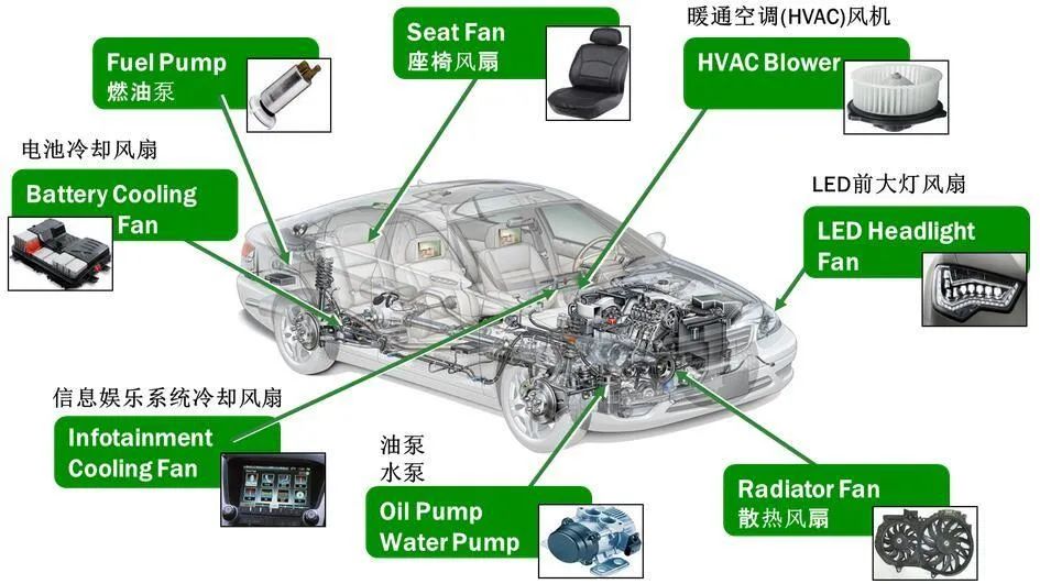 BLDC 相較有刷直流電機(jī)具有更快的速度、更高的效率、更低的噪音和更高的運行可靠性,但同時也需要復(fù)雜的電子控制。在電子控制技術(shù)日趨完善的今天,無刷直流電機(jī)市場得到了迅速擴(kuò)展,除了傳統(tǒng)車燃油泵 、冷卻水泵、HVAC 鼓風(fēng)機(jī)和電子風(fēng)扇之外,尤其在自動駕駛及新能源汽車上,更是得到了廣泛應(yīng)用:如MCU\EMS\電池系統(tǒng)的風(fēng)冷系統(tǒng),和水冷系統(tǒng)中的電子水泵,空調(diào)系統(tǒng)的電子壓縮機(jī),制動助力用的電子真空泵,以及AFS、座椅調(diào)節(jié)、和電動助力轉(zhuǎn)向EPS等等。![]()
